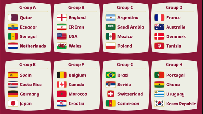 So far there are 32 confirmed countries participating in the World Cup, with each group consisting of four countries. The current structure is: